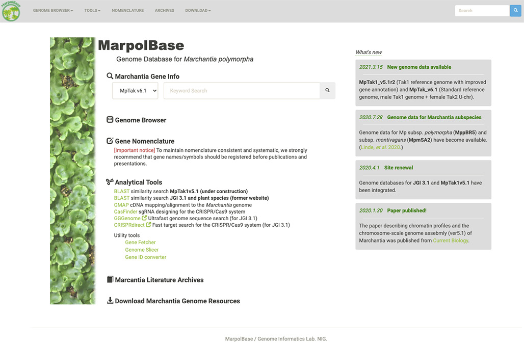 Under these circumstances, 39 international and domestic universities including the National Institute of Genetics, Kinki University, Kobe University, the National Institute for Basic Biology, Tohoku University, the US Department of Energy, and Monash University in Australia, created a consortium to shed light on the overall liverwort genome structure, which was a significant project. I believe that this consortium was assisted by the full-scale introduction of the next-generation sequencer that can read DNA sequences at a very high speed and with high precision at a relatively low cost, and the development of the “long-read method” that made it possible to read DNA nucleotide sequences longer than 10,000 bases in one go. My laboratory group was responsible for using the NIG supercomputer to link fragmented genome sequences accurately, and for constructing a database by predicting genes.