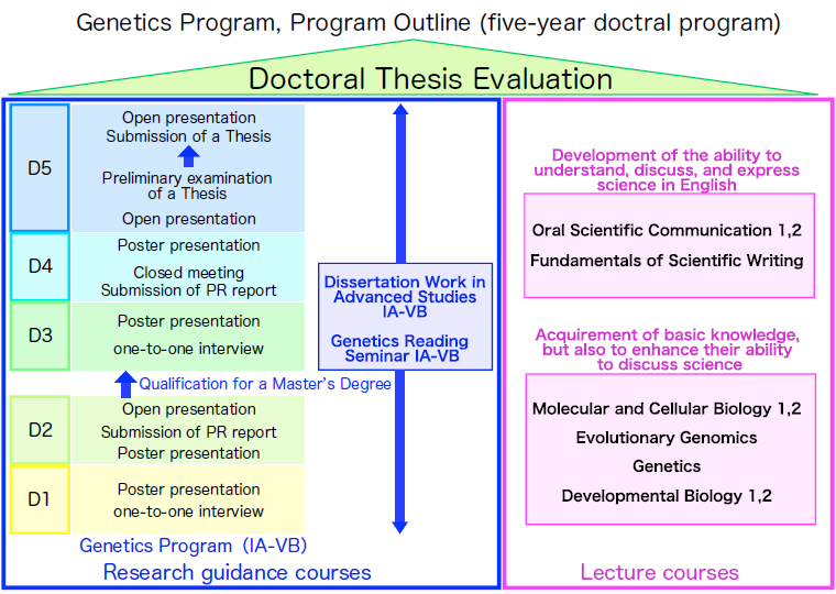 At each course level, grades (A, B, C, D) are determined based on various viewpoints specified on the syllabus. In “Genetics Progress I-V”, in which research abilities of individual students are directly and objectively assessed, the Progress Committee writes a report about each student’s research performances and suggestions by the committee, and submits it to the student and his/her supervisor, in addition to the regular (A, B, C, D) grading. The report is shared by all the faculty at the Genetics Program.