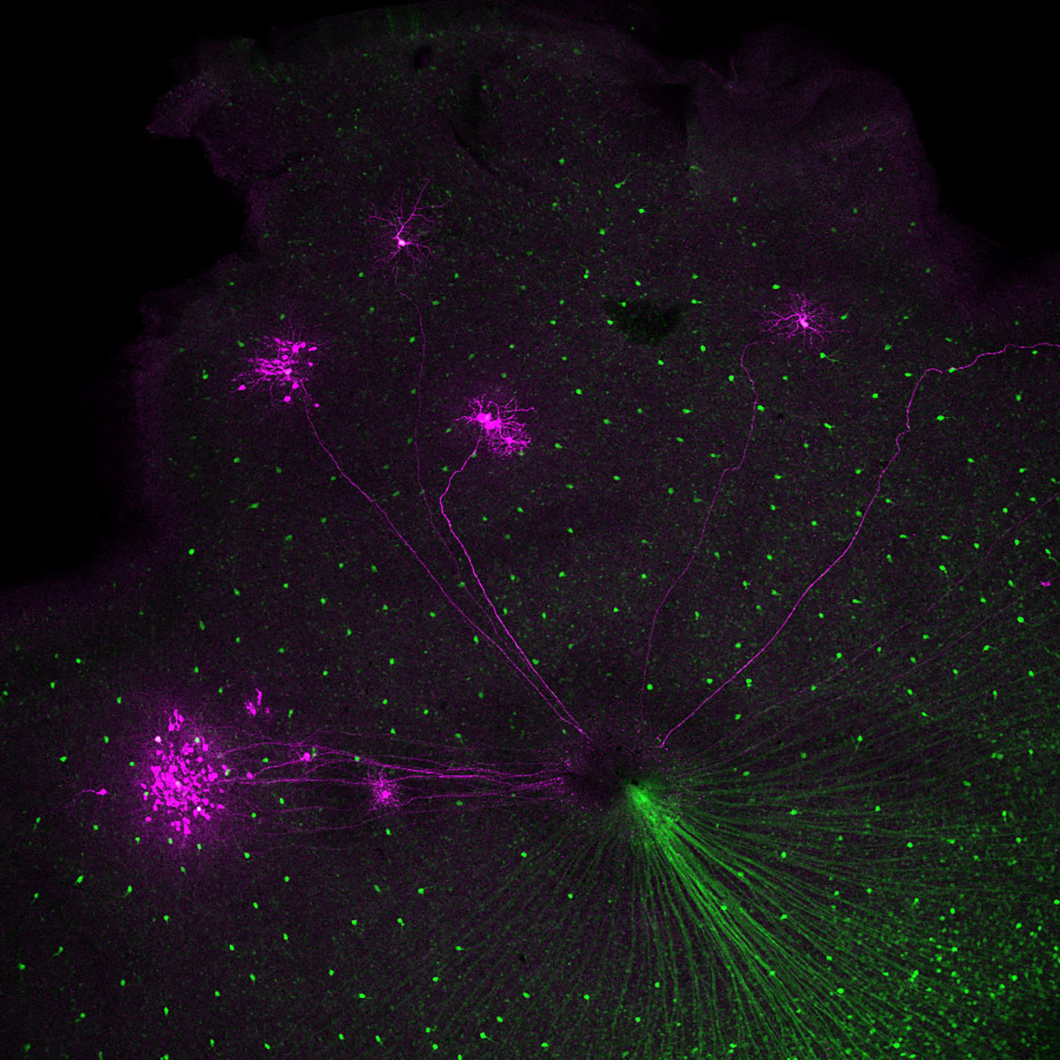 ここで非常に驚いたことがあります。脳からたどって網膜に到着したもののうち、半分はGFP標識細胞と一致しました。ですが、残りの半分はGFP標識細胞ではありませんでした。ということは、脳の内側核へは、GFP標識細胞だけでなくGFP非標識細胞からも回路が伸びていたことになります。それならば、GFP標識細胞とGFP非標識細胞は、一方が上方向で、もう一方が下方向の選択性をもつのかもしれない。つまり、このGFP標識によって、どちらか1種類の方向選択性をもつ細胞を特定できるはずだ。そう気づいた私は、これは重要な発見になると身震いしました。暗室で共焦点顕微鏡をのぞき、びっくりして飛び上がったその瞬間を、今でも鮮明に覚えています。