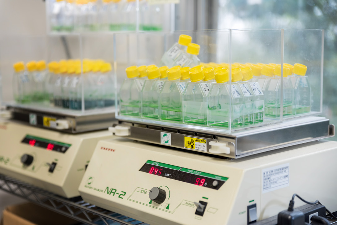 宮城島は、シゾンと国内で見つけた新種を、機能性食品や飼料として産業利用するための基礎研究を行うグループにも属しており、そのリーダーとして、すでに8年目を迎えている。シゾンのような微細藻類(個体の識別に顕微鏡が必要な藻類のこと)は、陸上植物に比べて光合成能力が高く、生育場所を選ばずに大量培養が可能なので、いくつかの種がすでに産業利用されている。「そうした微細生物に比べても、シゾンとこの新種はさらに優れた特徴を持ちます」。細胞壁がないことはもちろんであるが、さらに、セルフクローニング法(遺伝的改変法の一種)を開発できたことや、酸性水で増殖するので、他の生物の混入増殖の恐れがなく、屋外で大量培養できることなどである。