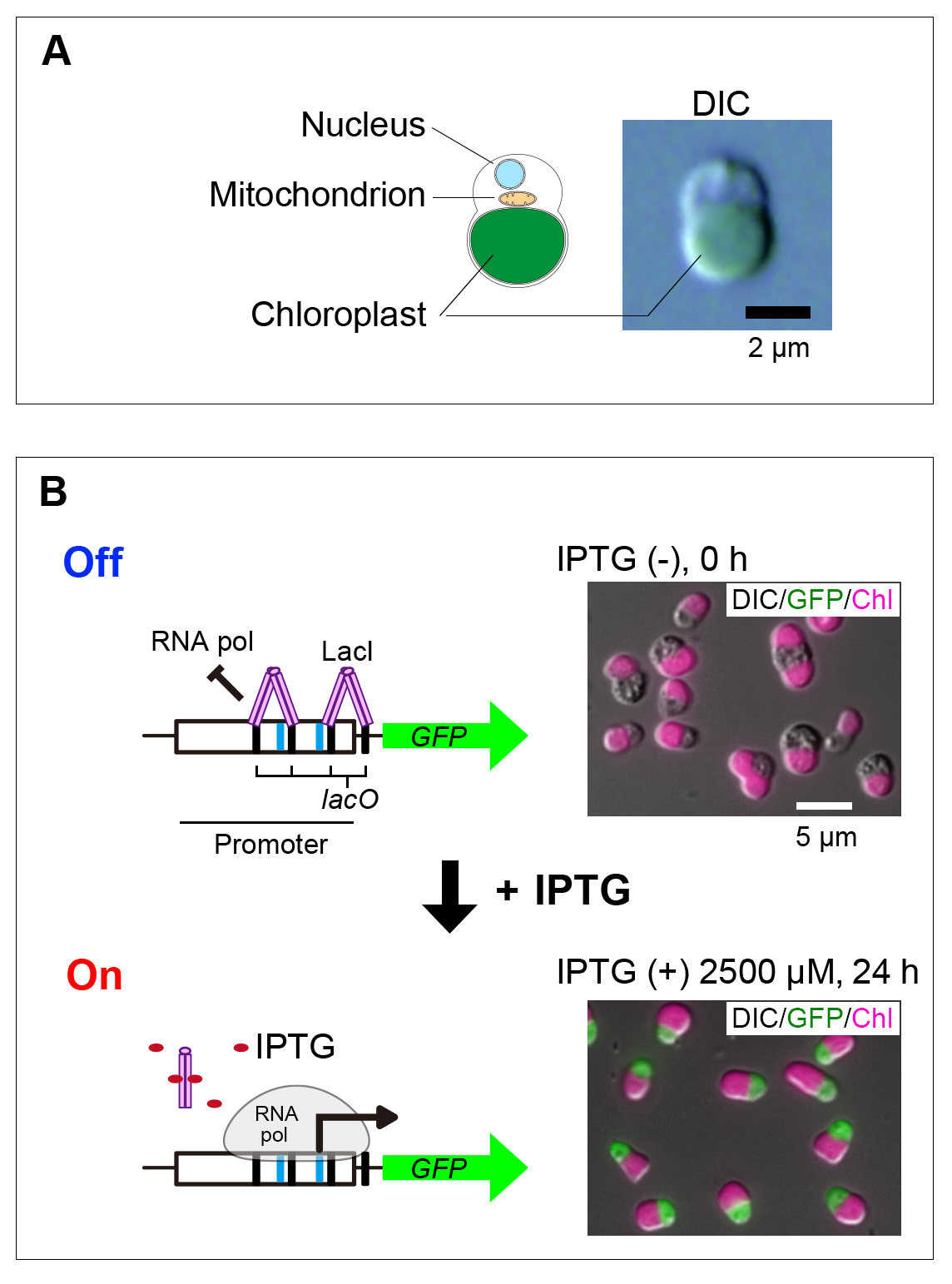 (B) Schematic overview of the IPTG-inducible gene expression system and fluorescence microscopy images of cells expressing the reporter protein GFP (green) in an IPTG-dependent manner. Four lac operator (lacO) sequences were inserted into the promoter region, and an Escherichia coli–derived LacI repressor was expressed separately to suppress transcription by binding to these sites. Upon addition of IPTG, LacI dissociates from the lacO sequences, allowing transcription to initiate. GFP protein expression was detected from 4 hours after IPTG addition. DIC images show cell outlines, GFP (green) indicates cytosolic fluorescence, and Chl (magenta) represents chloroplast autofluorescence. Scale bars are indicated in the images.