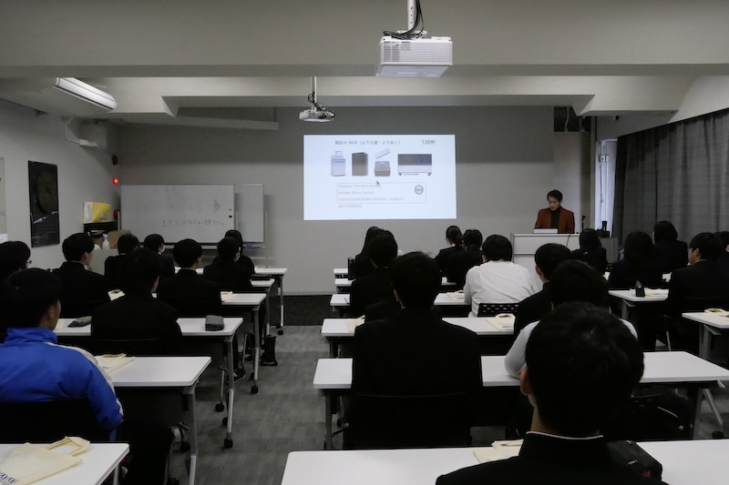 静岡県立清水東高校理数科1年生約40名が12月17日、国立遺伝学研究所を訪問し、大量遺伝情報研究室の中村保一教授と植物遺伝研究室の佐藤豊教授による講義が行われました。また、比較ゲノム解析研究室の豊田敦特任教授によるシーケンサー室の見学と、佐藤教授によるイネ栽培施設の案内も行われ、最先端の遺伝学研究に触れていただきました。