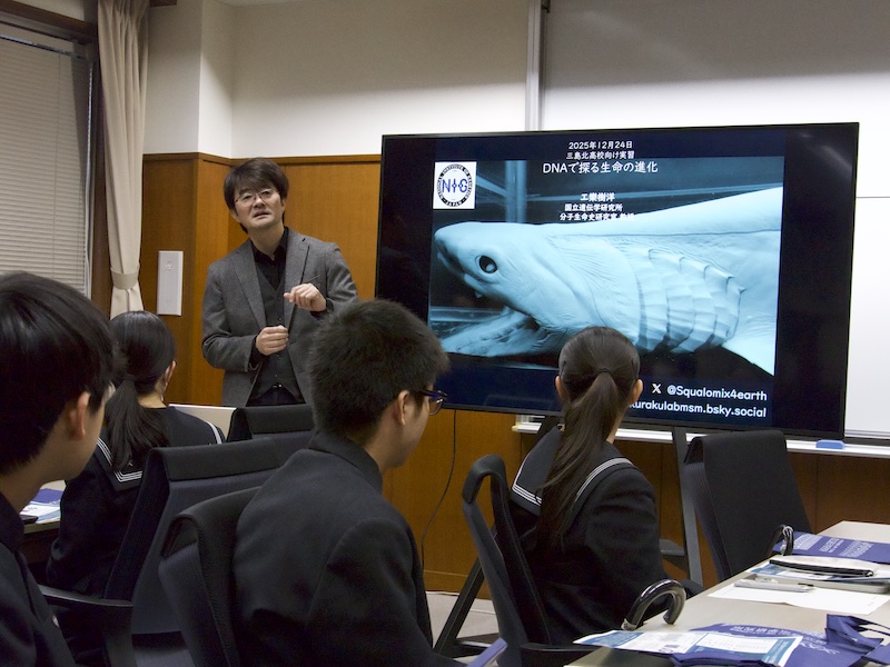 静岡県立三島北高校の生徒11名が12月24日、国立遺伝学研究所を訪問しました。分子生命史研究室の工樂樹洋教授による「DNAで探る生命の進化」をテーマとした講義のほか、サメが飼育されている工樂研の見学も行われました。